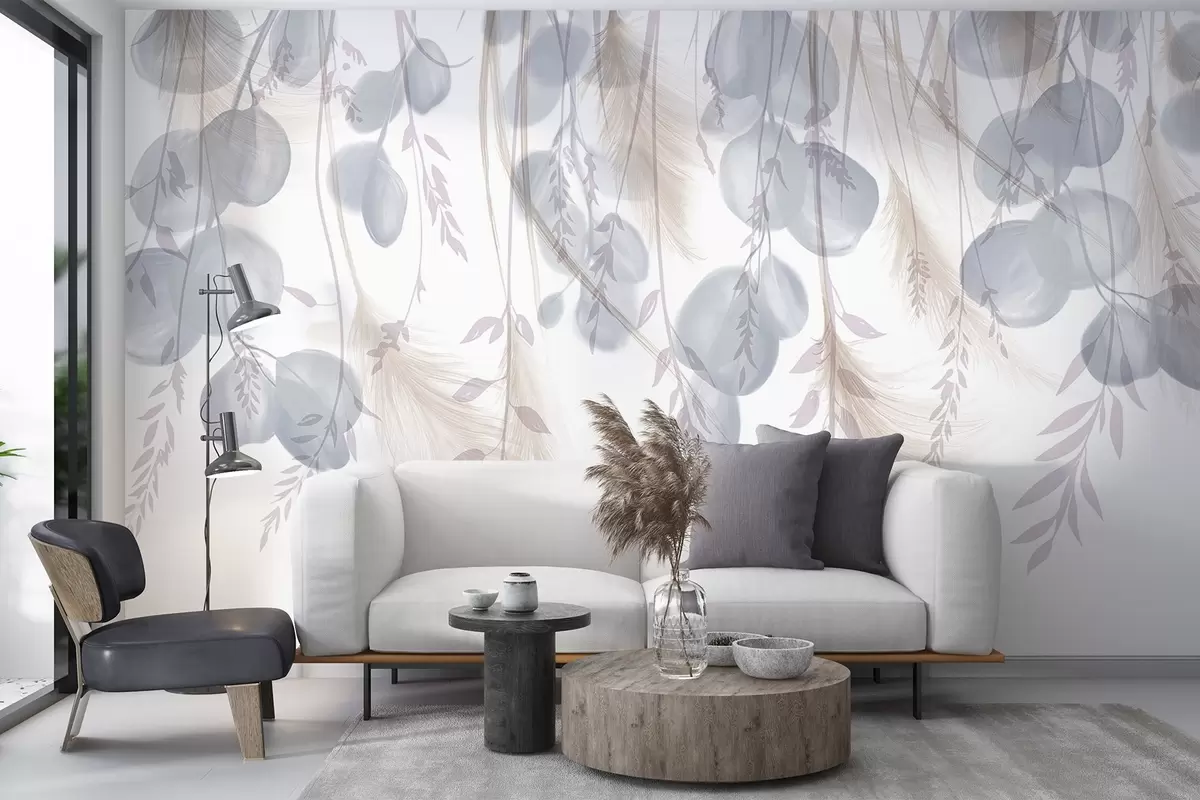 Fototapetes Smalki zilas un pasteļbēšas eikalipta lapas krīt, radot mierīgu un nomierinošu atmosfēru Nr. w08380v1
