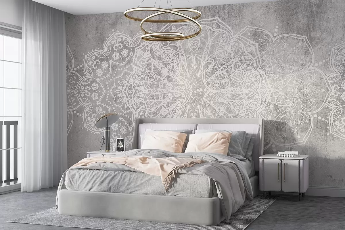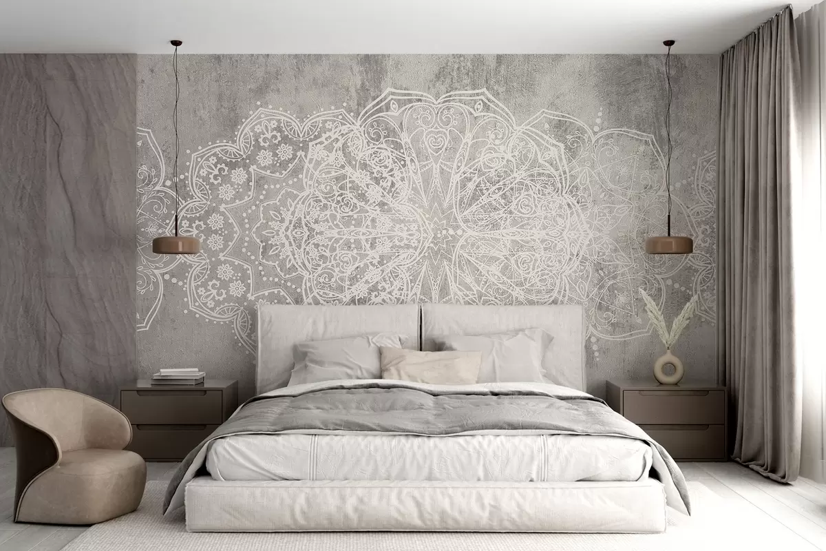 Fototapetes Detalizēts, sarežģīts balts mežģīņu mandalas raksts uz teksturēta bēniņu pelēka sienas fona Nr. w08387