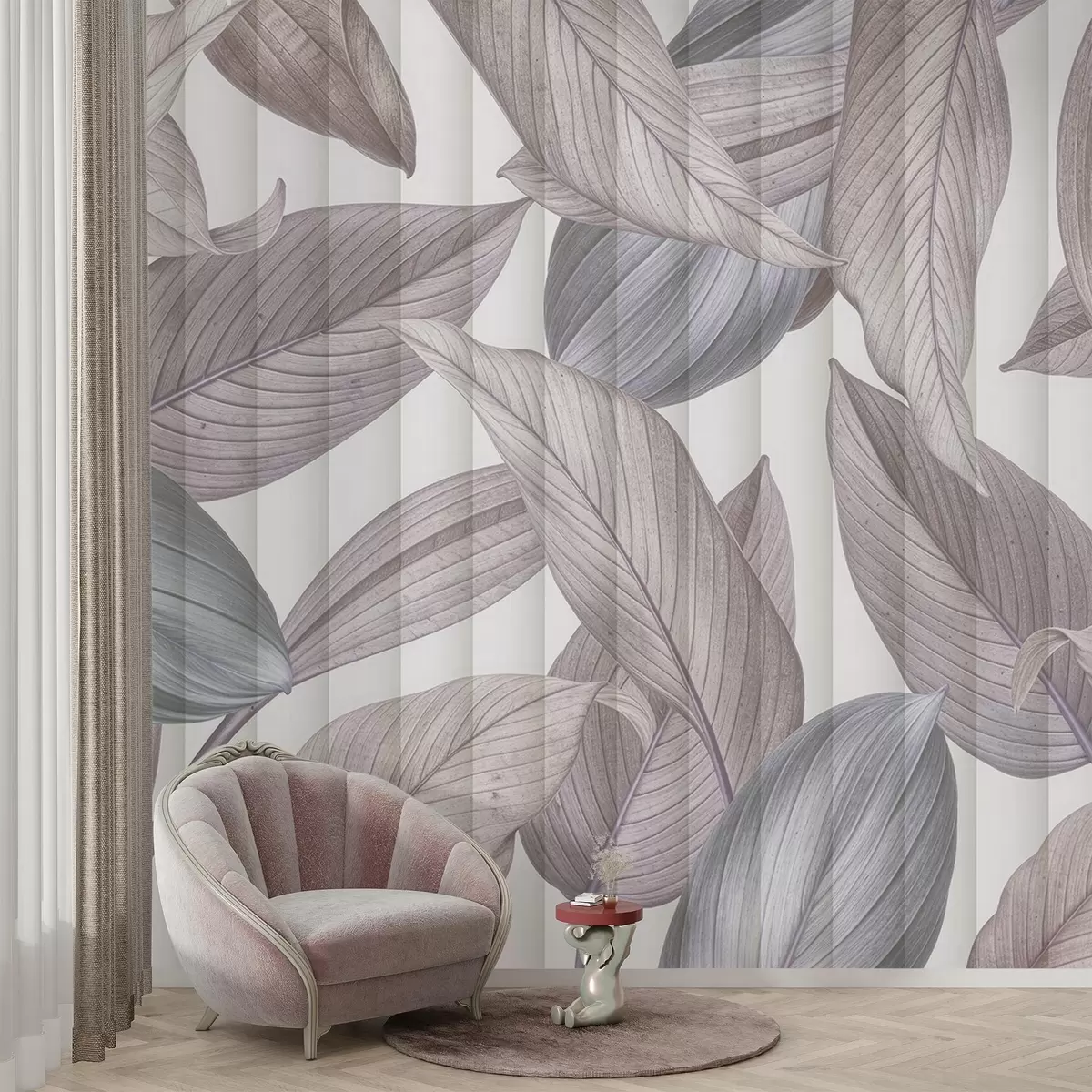 Fototapetes Abstraktas detalizētas lapas zilos, pelēkos un pasteļrozā toņos uz gaiša fona Nr. w08388v1