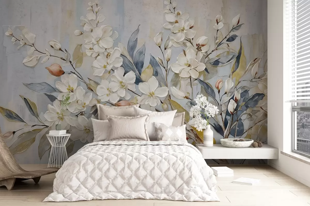 Fototapetes Pasteliski maigi balti ziedi ar dzelteniem centriem, ko ieskauj sulīgi zaļas lapas un zari w08399v1