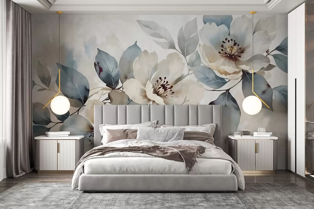 Fototapetes Delikāts akvareļu tekstūras balts un zils ziedu kompozīcija ar mīkstiem ziedlapiņām un centriem Nr. w08401