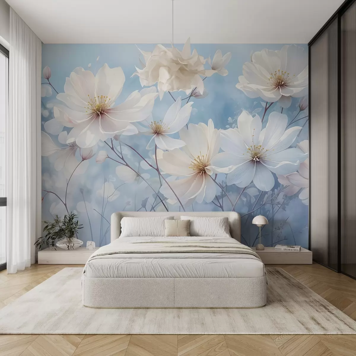 Fototapetes Smalki balti ziedi ar maigiem ziedlapiņām uz izplūduša zila fona, kas rada mierīgu un ēterisku atmosfēru Nr. w08412