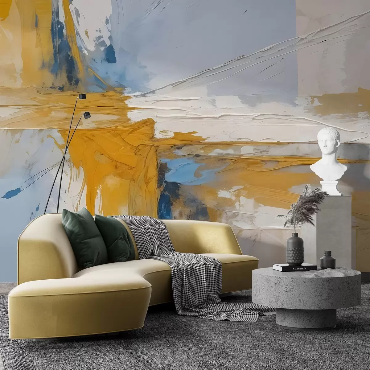 Fototapetes Minimālistiska abstraktās mākslas kompozīcija ar drosmīgiem dzeltenas, zilas un baltas krāsas triepieniem Nr. w08414