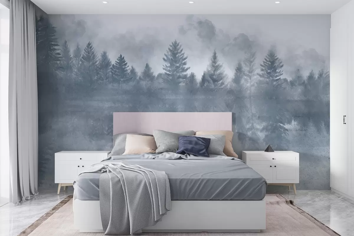Fototapetes Mierīga ainava ar aizsalušu ezeru, ko ieskauj blīvs priežu mežs, ar miglainu, miglainu atmosfēru Nr. w08415