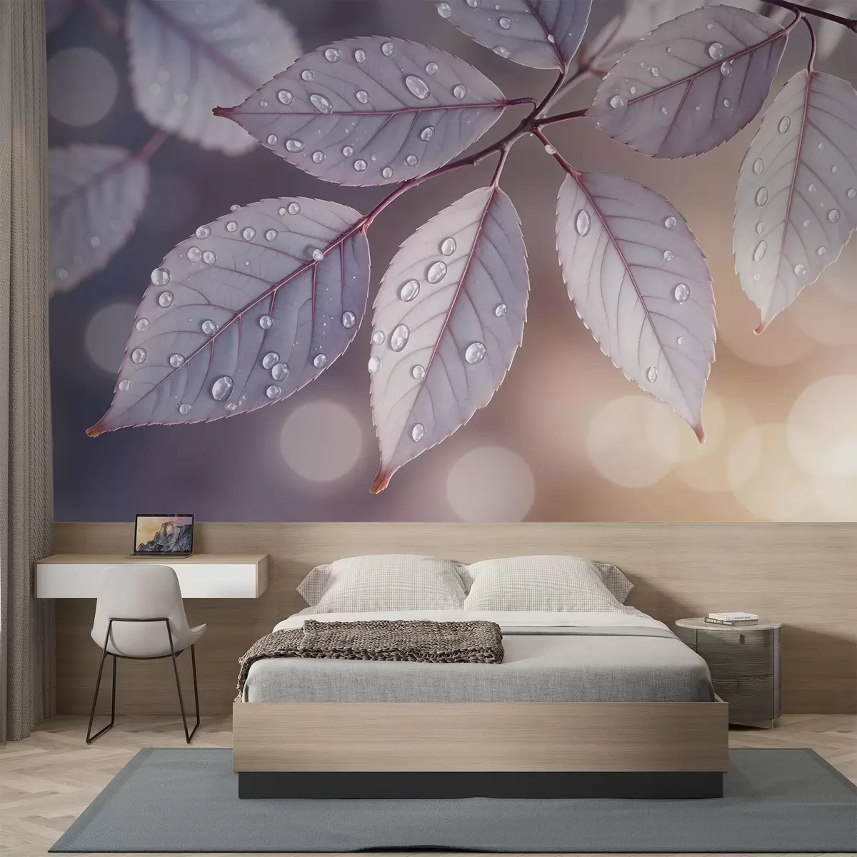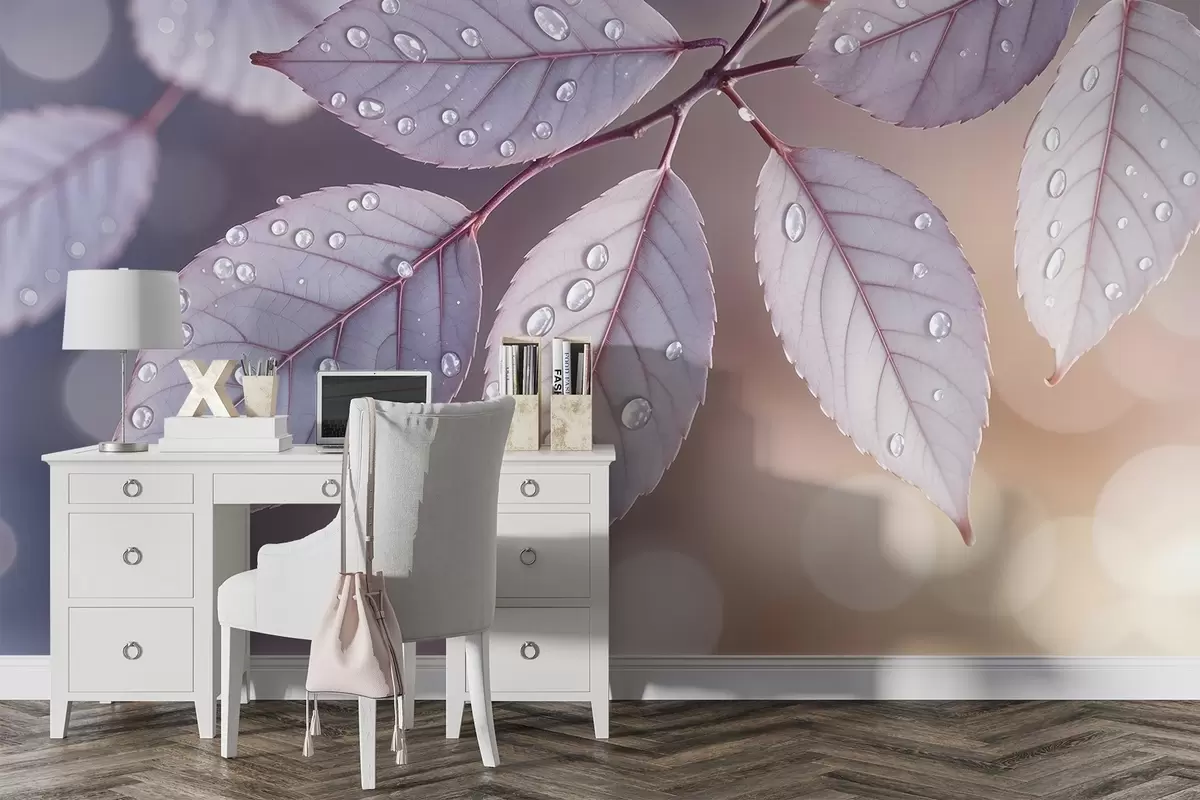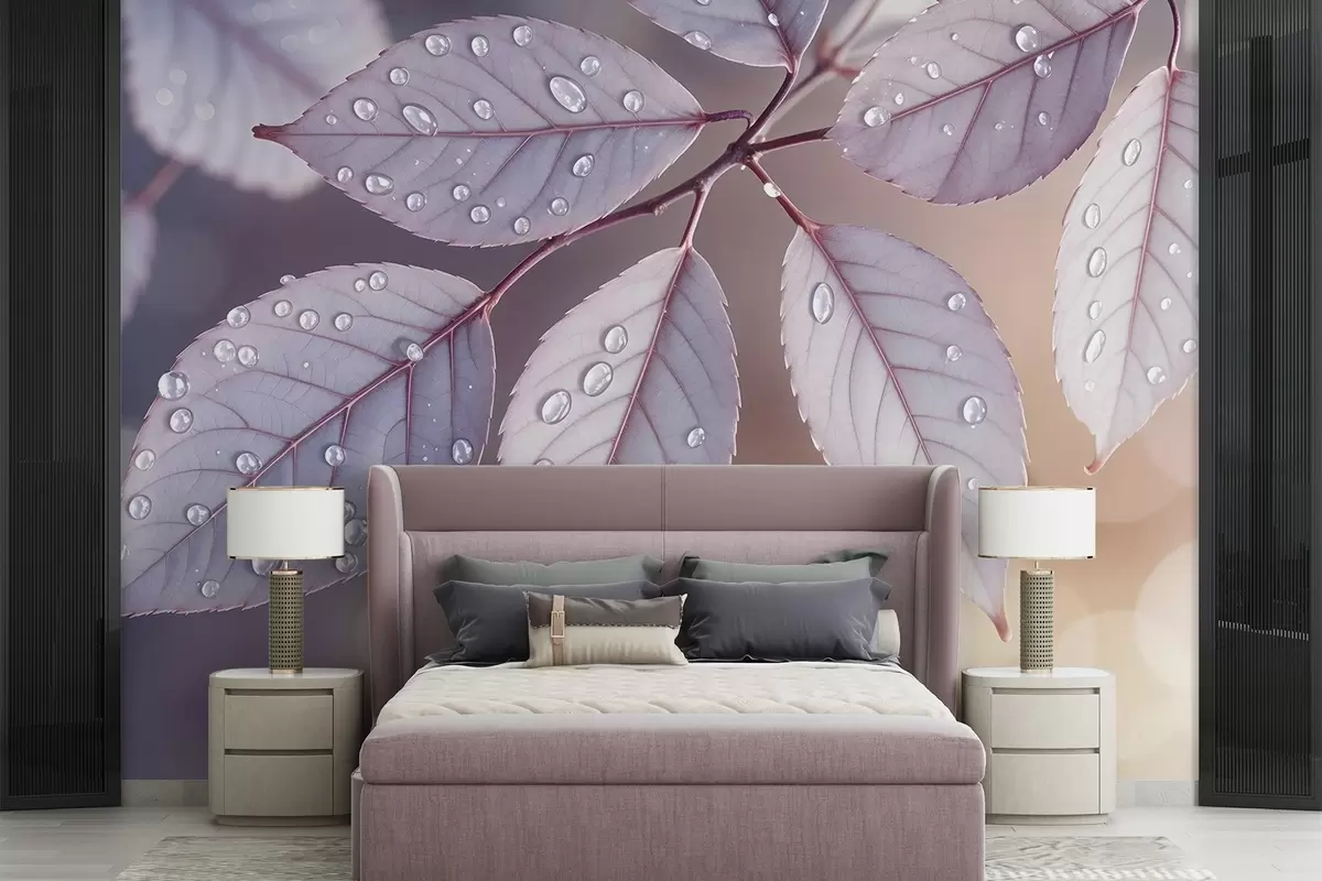 Fototapetes Maigi violetas lapas ar ūdens pilieniem, mīksts fokusa fons Nr. w08419
