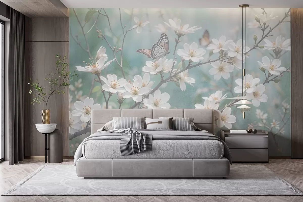 Fototapetes Balts tauriņš uz zara ar maigiem baltiem ķiršu ziediem priekšplānā uz neskaidra fona Nr. w08421