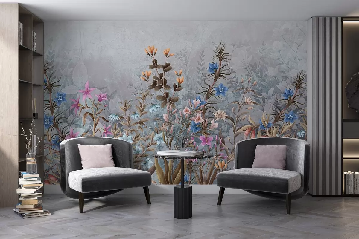 Fototapetes Sulīga, koša, spilgta ziedu tekstūras apdruka ar krāsainiem ziediem un augiem ar sarežģītām detaļām un faktūrām Nr. w08428