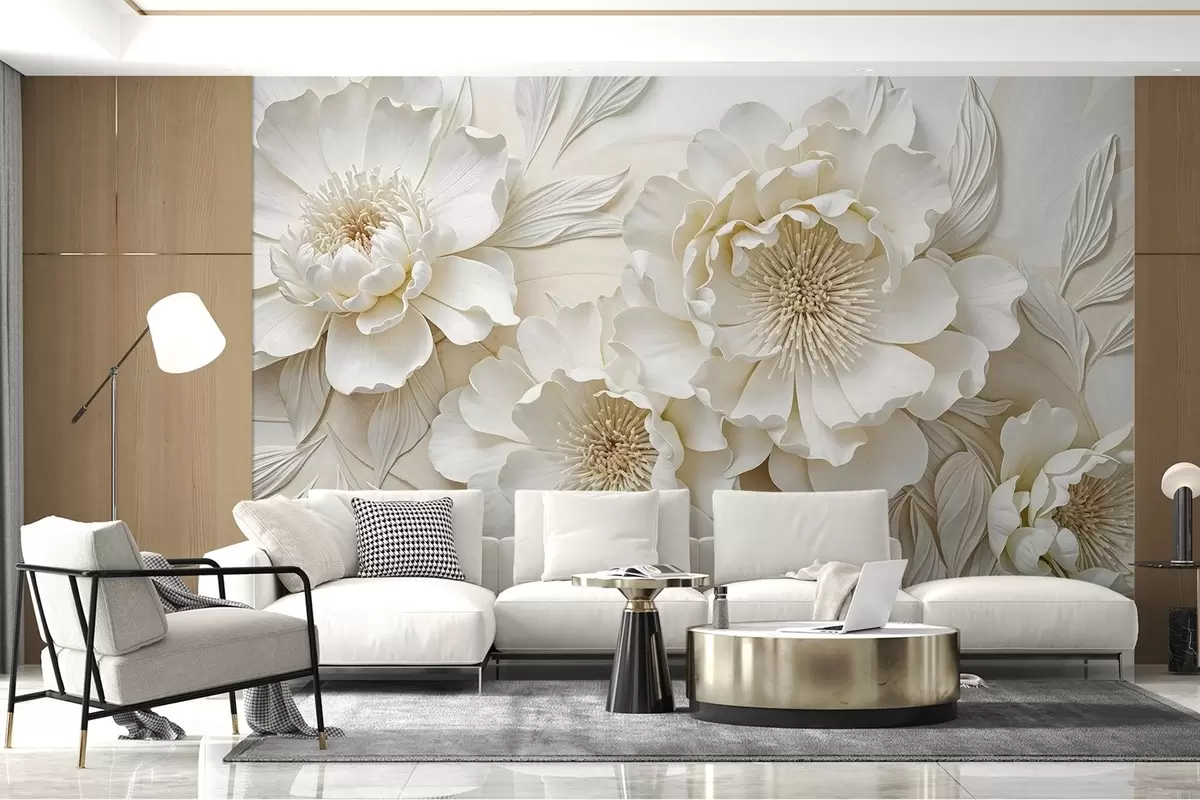 Fototapetes Eleganti apjomīgi baltas peonijas ziedu imitācija ar maigiem ziedlapiņām un pasteļdzelteniem centriem uz gaiša fona Nr. w08431