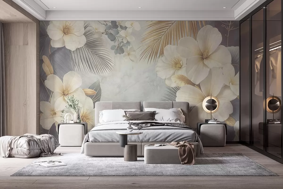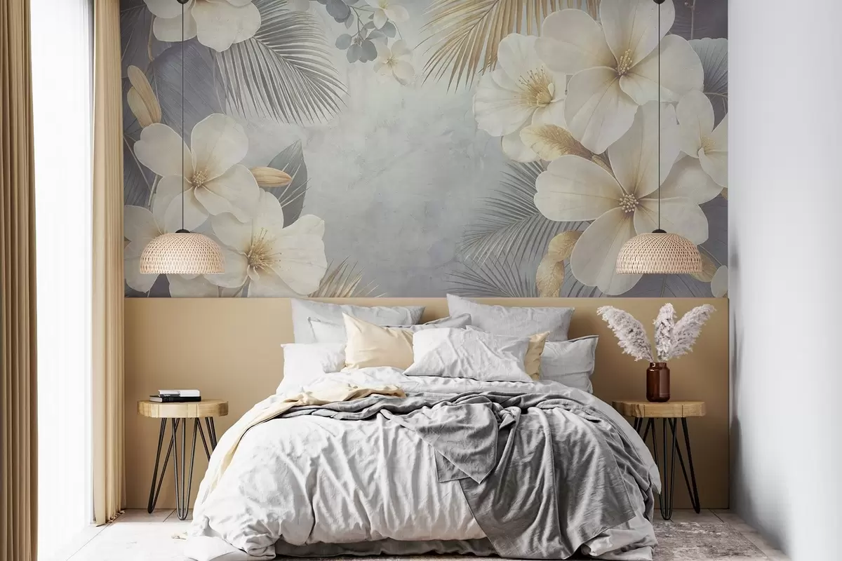 Fototapetes Tropu ziedu raksts ar lieliem baltiem un dzelteniem hibiskusa ziediem, palmu lapām pieklusinātos pelēkos un bēšos toņos Nr. w08445