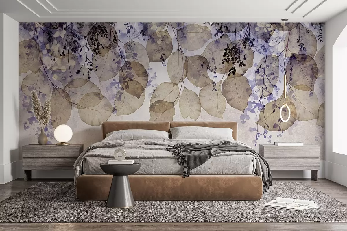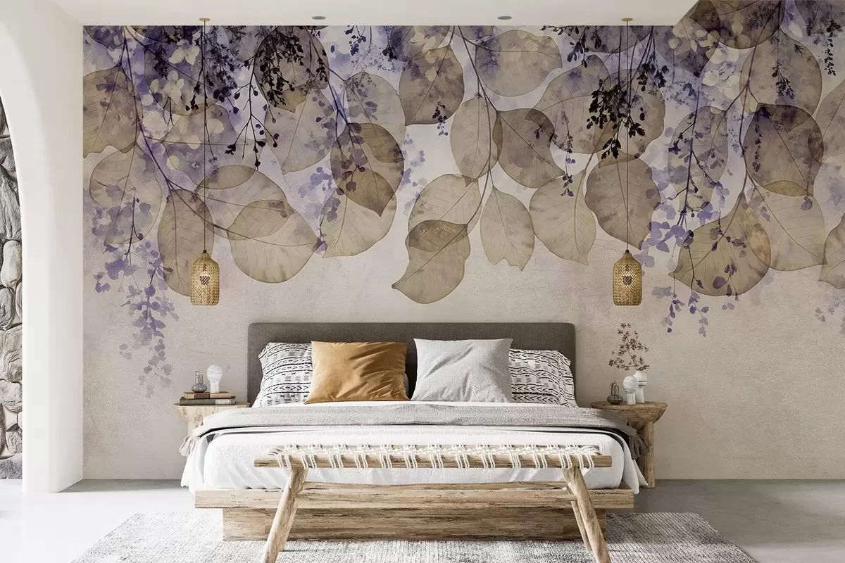 Fototapetes Maigi kaltētas lapas un ziedi violetos, bēšos un baltos toņos uz gaiša faktūrfona Nr. w08447