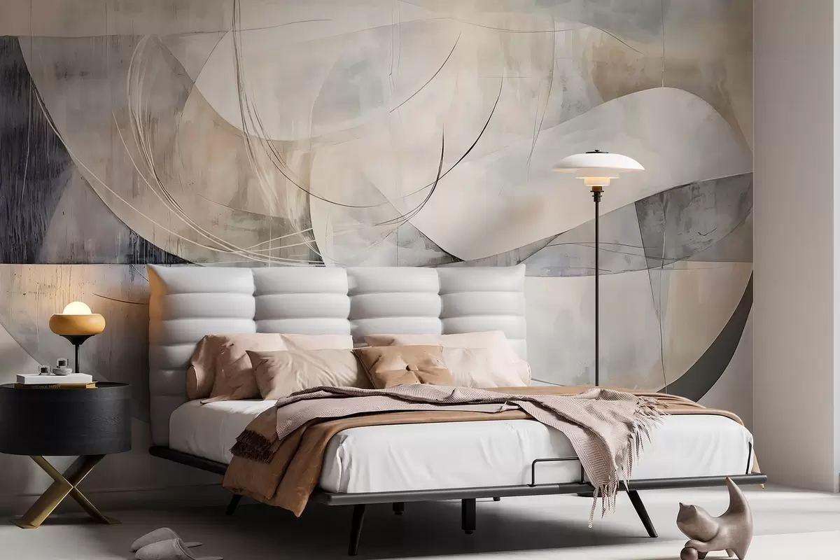 Fototapetes Abstraktas formas un veidlapas baltā, pelēkā, bēšā un zilā krāsā uz izplūduša teksturēta fona Nr. w08461