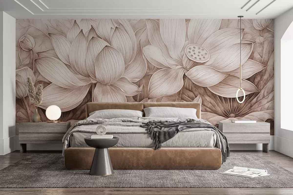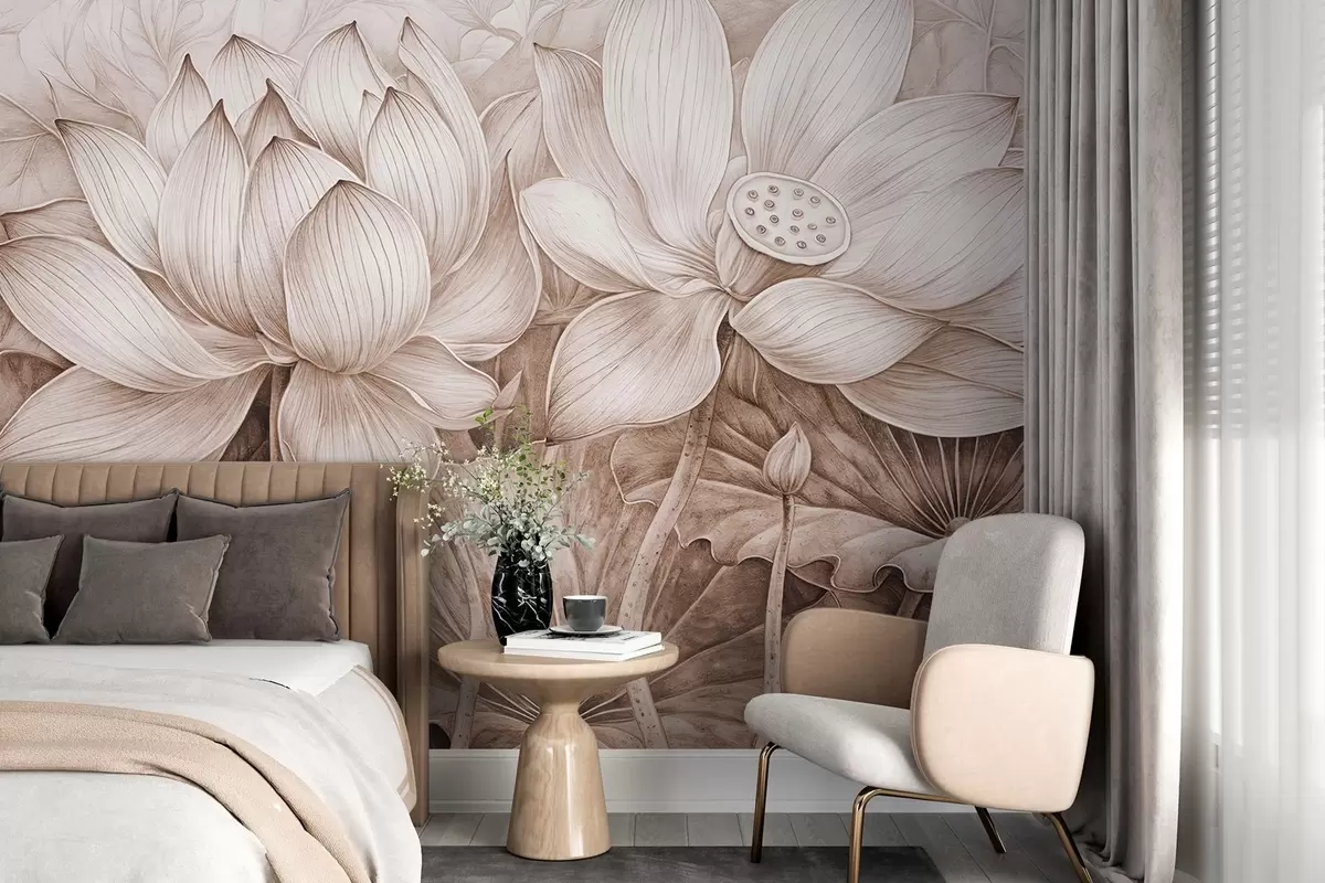 Fototapetes Vairāki detalizēti teksturēti lieli smilškrāsas lotosa ziedi ar brūnām lapām un kātiņiem uz gaiša fona Nr. w08465v1