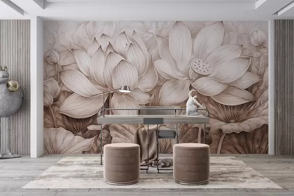 Fototapetes Vairāki detalizēti teksturēti lieli smilškrāsas lotosa ziedi ar brūnām lapām un kātiņiem uz gaiša fona Nr. w08465v1