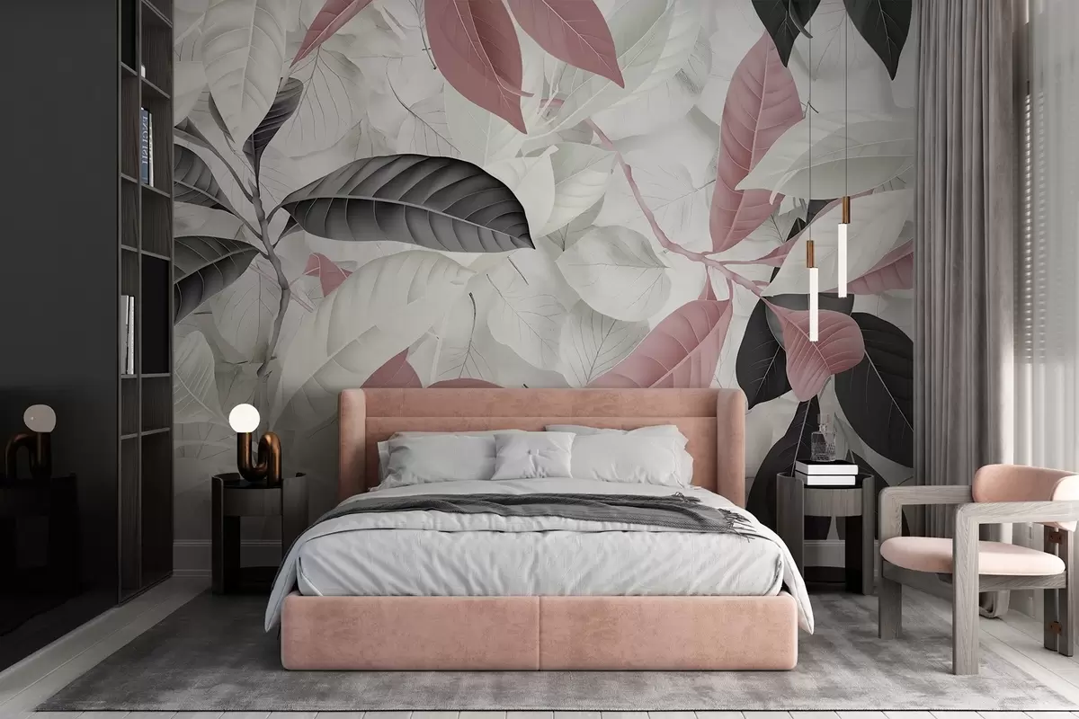 Fototapetes Liela rozā un pelēku lapu apdruka uz gaišu lapu faktūras fona, kas rada sulīgu tropu noskaņu Nr. w08468