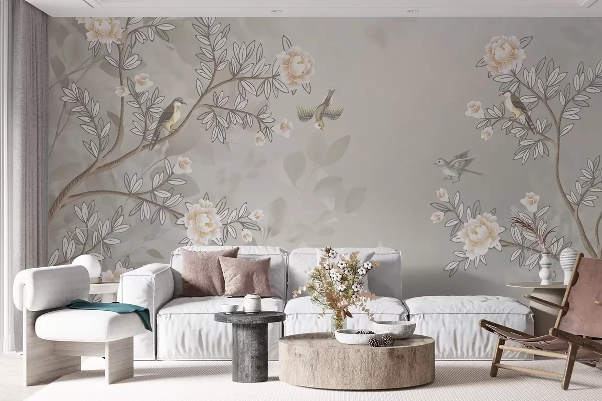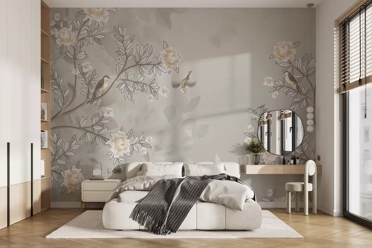 Fototapetes Zari ar rozēm un lidojošiem putniem gaišos toņos Nr. w08493