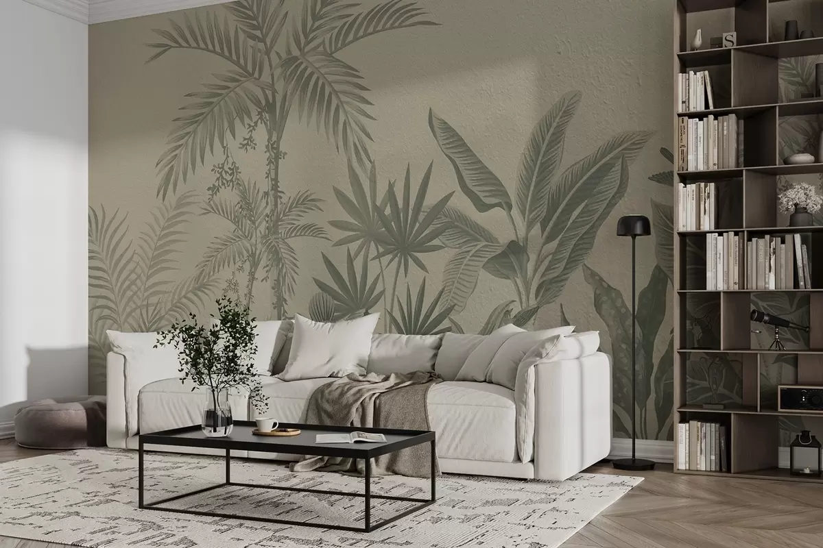 Fototapetes Tropu džungļi ar palmām un putniem zaļos toņos w08496v2