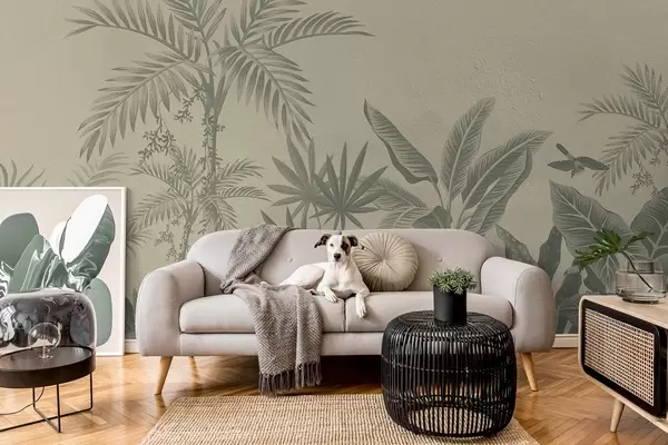 Fototapetes Tropu džungļi ar palmām un putniem zaļos toņos Nr. w08496v2