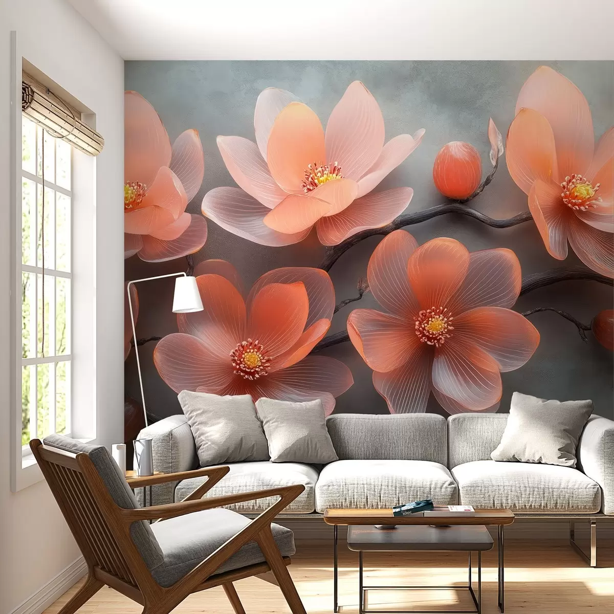 Fototapetes Caurspīdīgu stikla magnoliju ziedu pušķis uz pelēka betona fona Nr. w08497