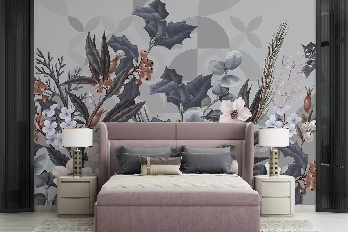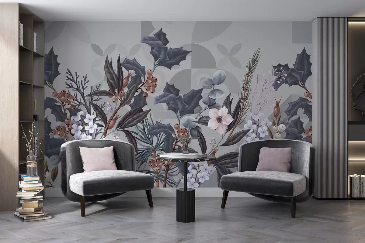 Fototapetes Ziedu kompozīcija ar lielām tumšām lapām, ziediem un ogām uz nobružāta pelēka ģeometriska abstrakta fona Nr. w08525