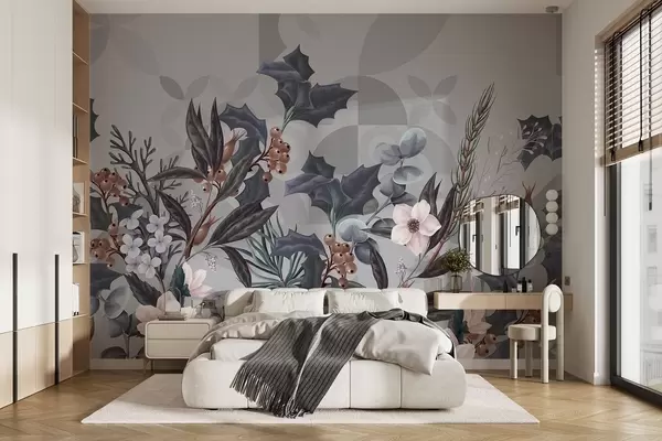 Fototapetes Ziedu kompozīcija ar lielām tumšām lapām, ziediem un ogām uz nobružāta pelēka ģeometriska abstrakta fona Nr. w08525