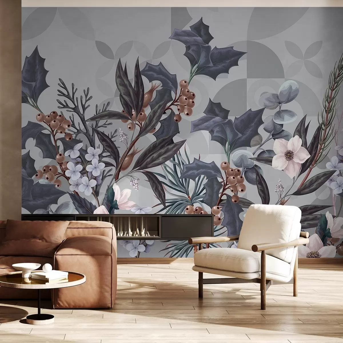 Fototapetes Ziedu kompozīcija ar lielām tumšām lapām, ziediem un ogām uz nobružāta pelēka ģeometriska abstrakta fona Nr. w08525