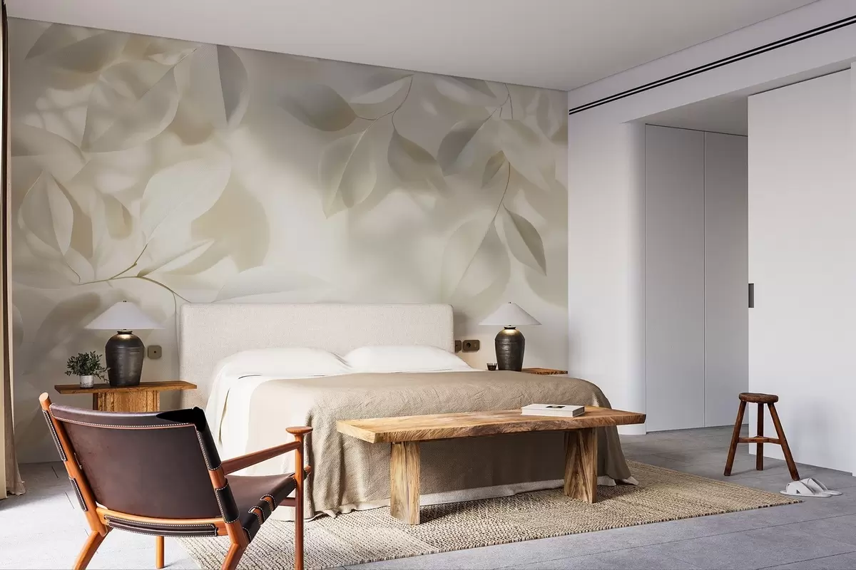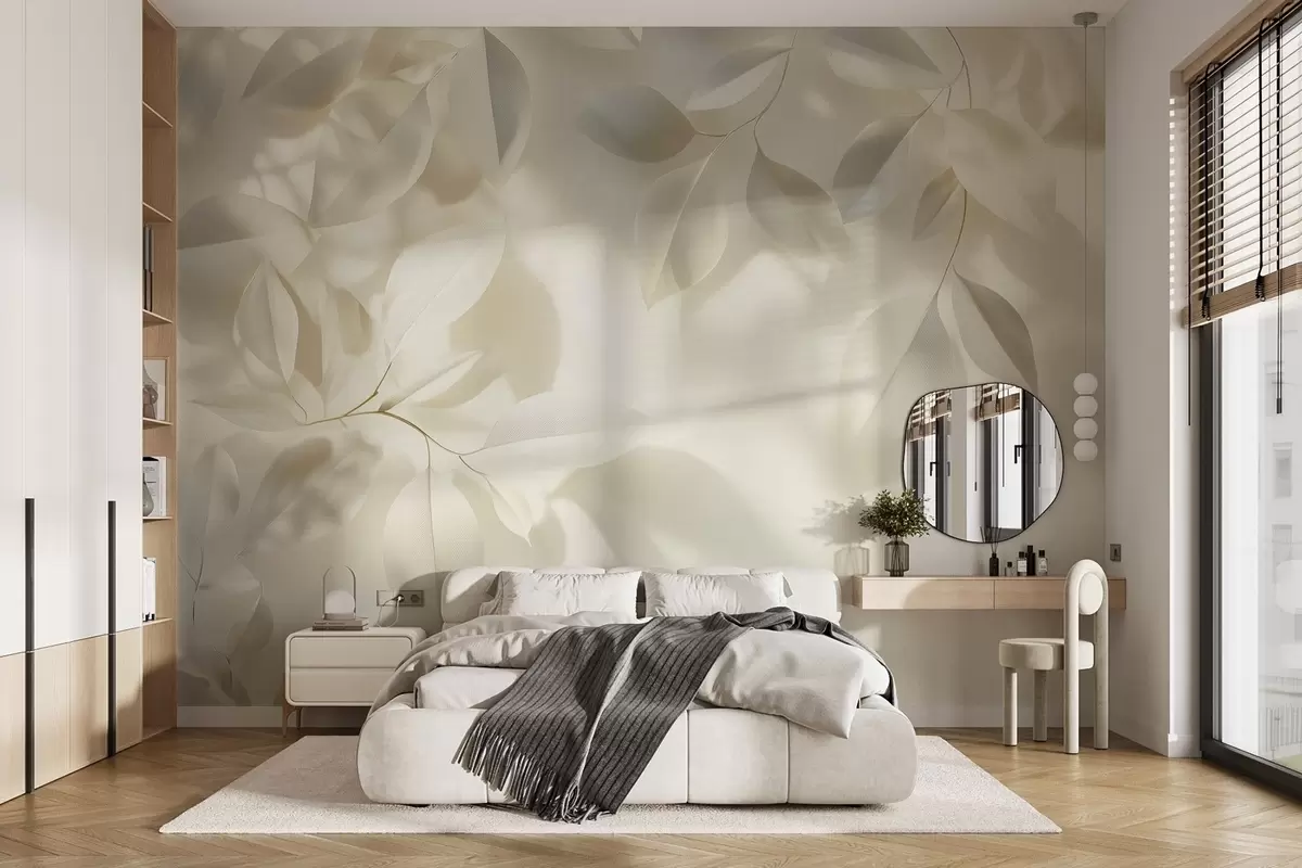 Fototapetes Pie sienas ar saules gaismu piekārti balti zari ar lapām Nr. w08552