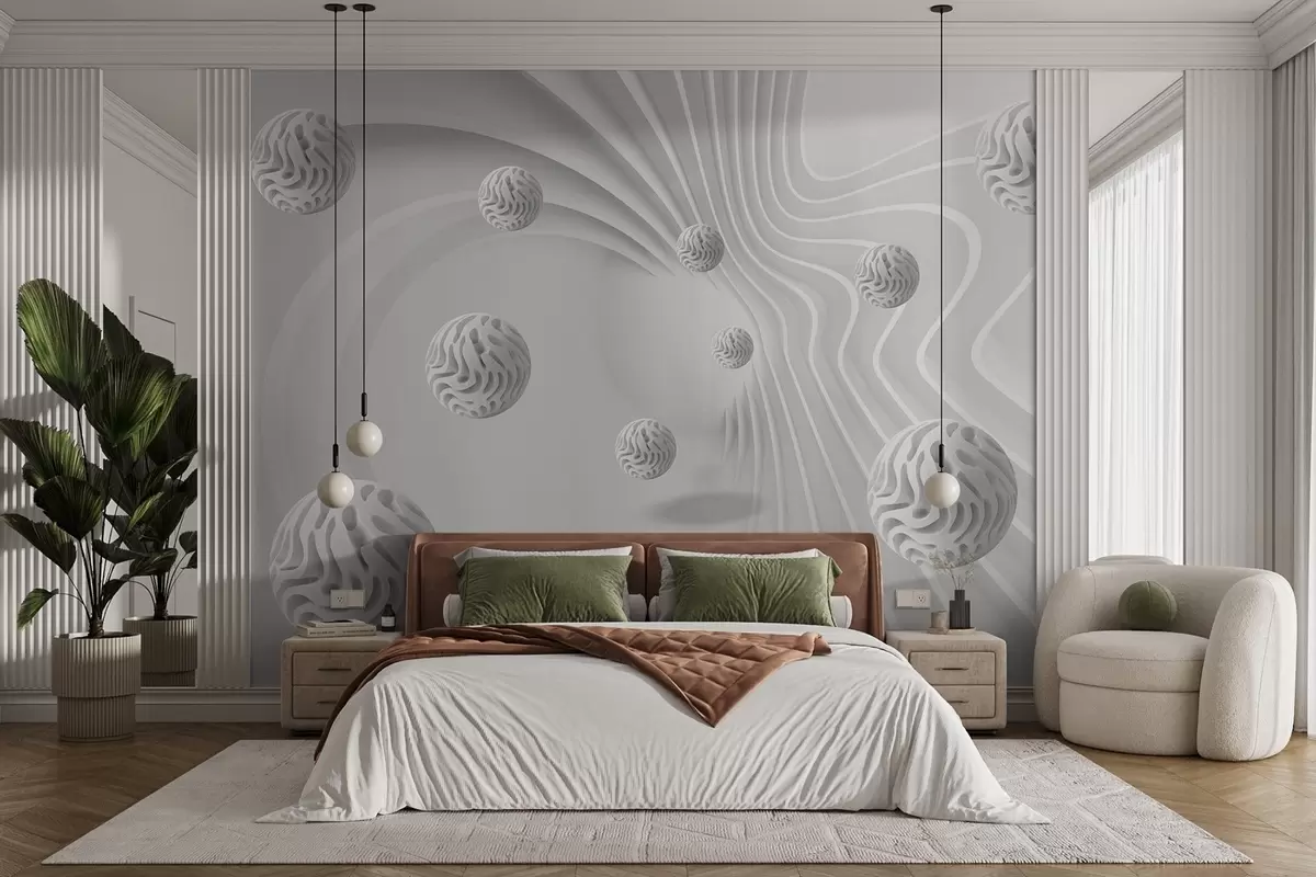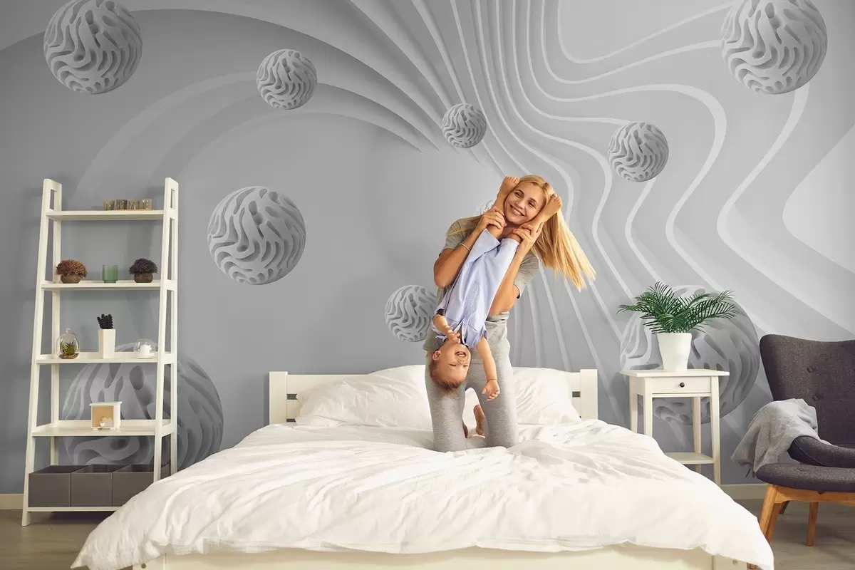 Fototapetes 3D pelēkā abstrakcija ar sfērām un dziļuma efektu Nr. w08553