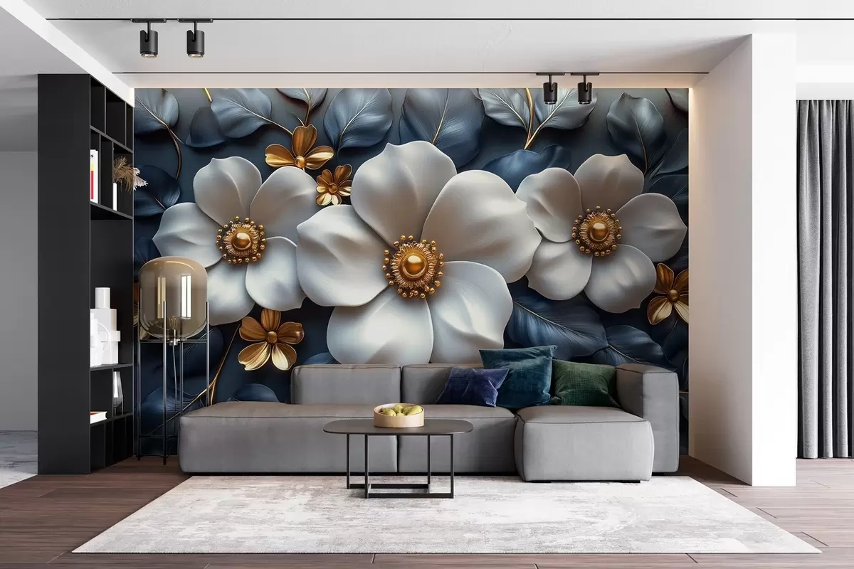 Fototapetes Lieli balti ziedi uz eleganta zila fona ar lapām Nr. w08559