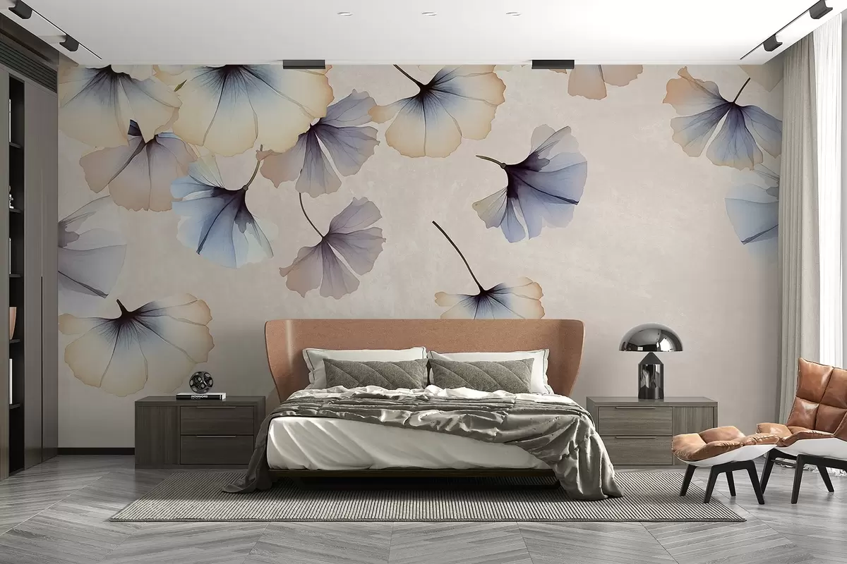 Fototapetes Pasteļkrāsas zilas un smilškrāsas ginkgo lapas ar maigām ziedlapiņām, kas peld gaisā uz faktūras fona Nr. w08578
