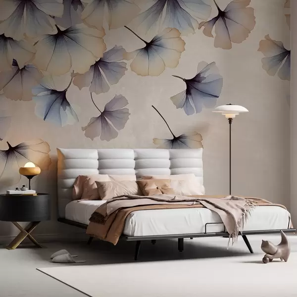 Fototapetes Pasteļkrāsas zilas un smilškrāsas ginkgo lapas ar maigām ziedlapiņām, kas peld gaisā uz faktūras fona Nr. w08578
