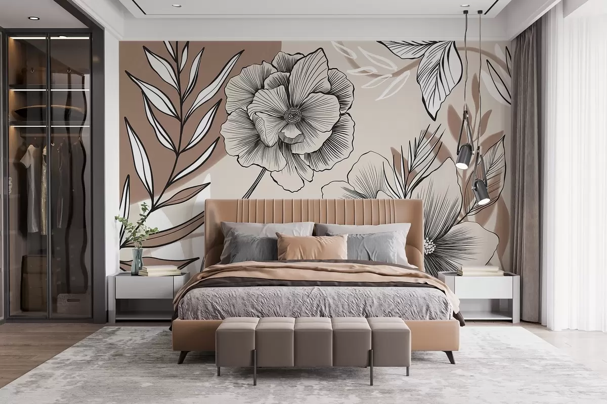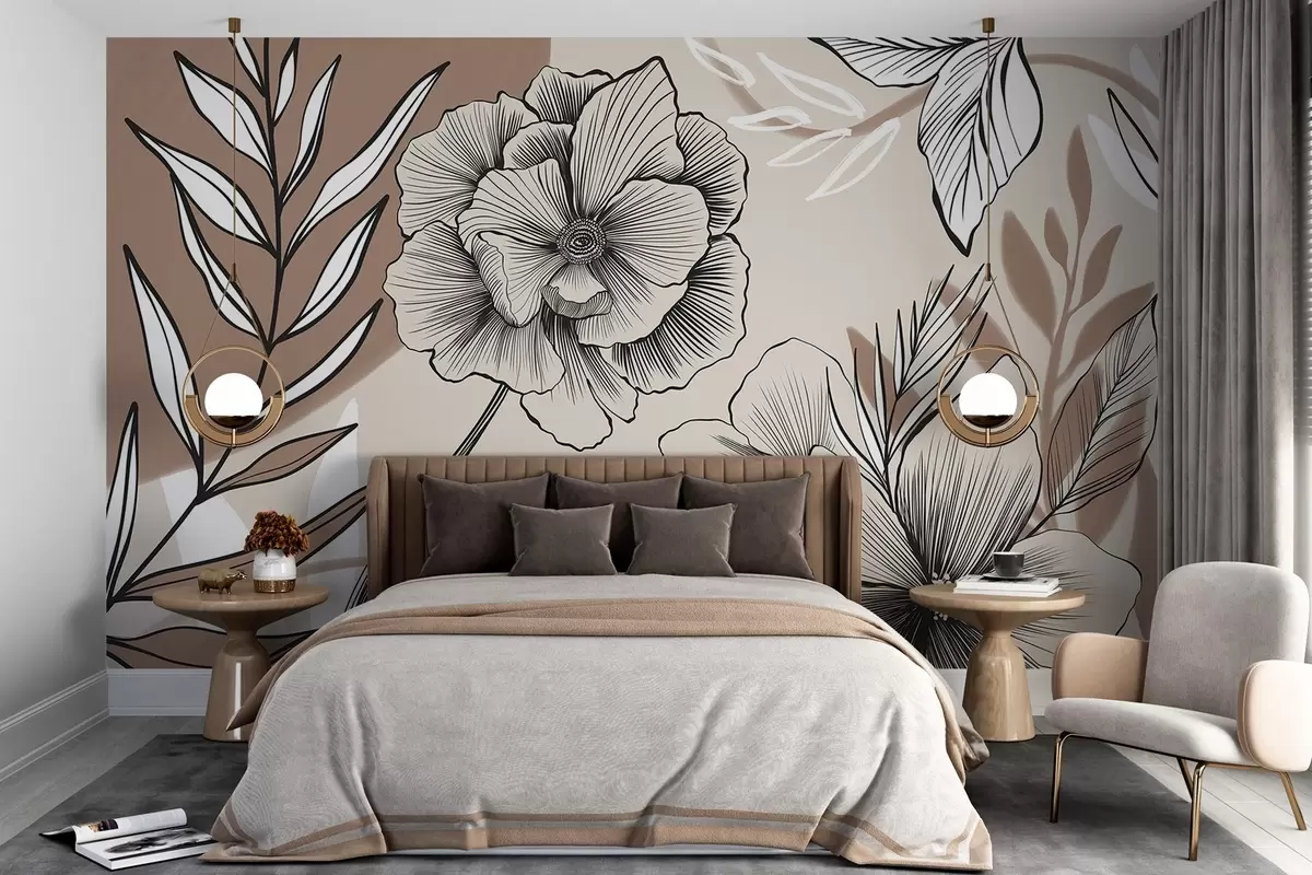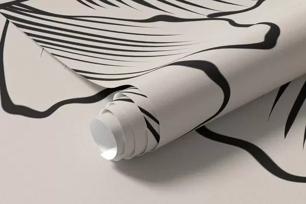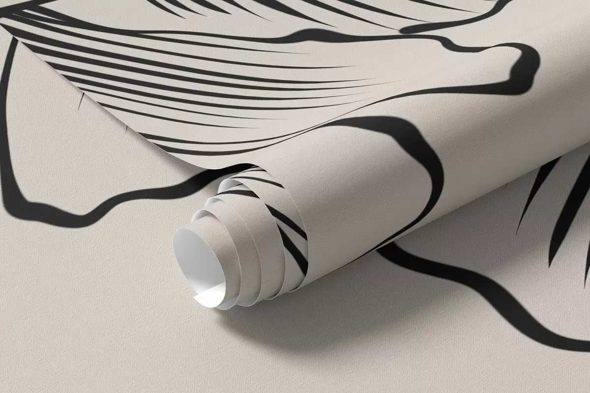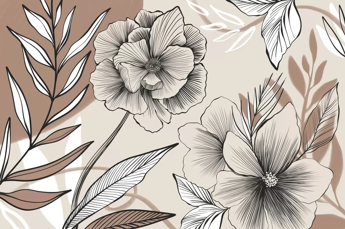 Fototapetes Lieli melnbalti grafiski ziedi ar detalizētām lapām uz bēša abstrakta fona Nr. w08580