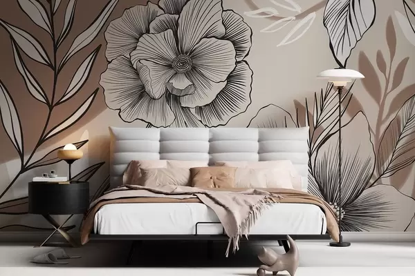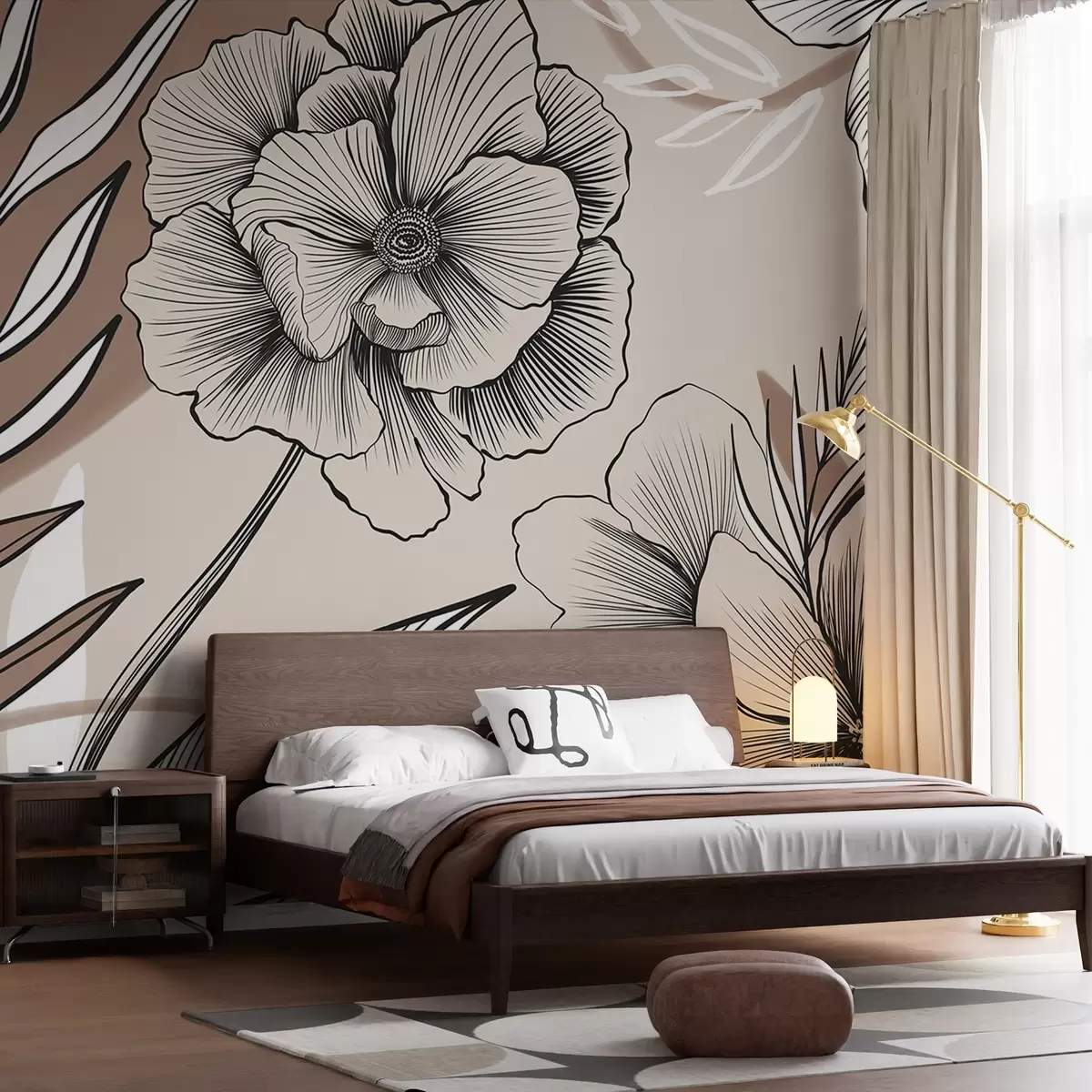 Fototapetes Lieli melnbalti grafiski ziedi ar detalizētām lapām uz bēša abstrakta fona Nr. w08580
