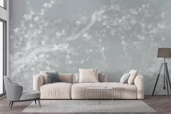 Fototapetes Neskaidra, nefokusēta izdruka ar baltiem miglainiem koku zariem ar mīkstu gaismas ziedu fonu Nr. w08581