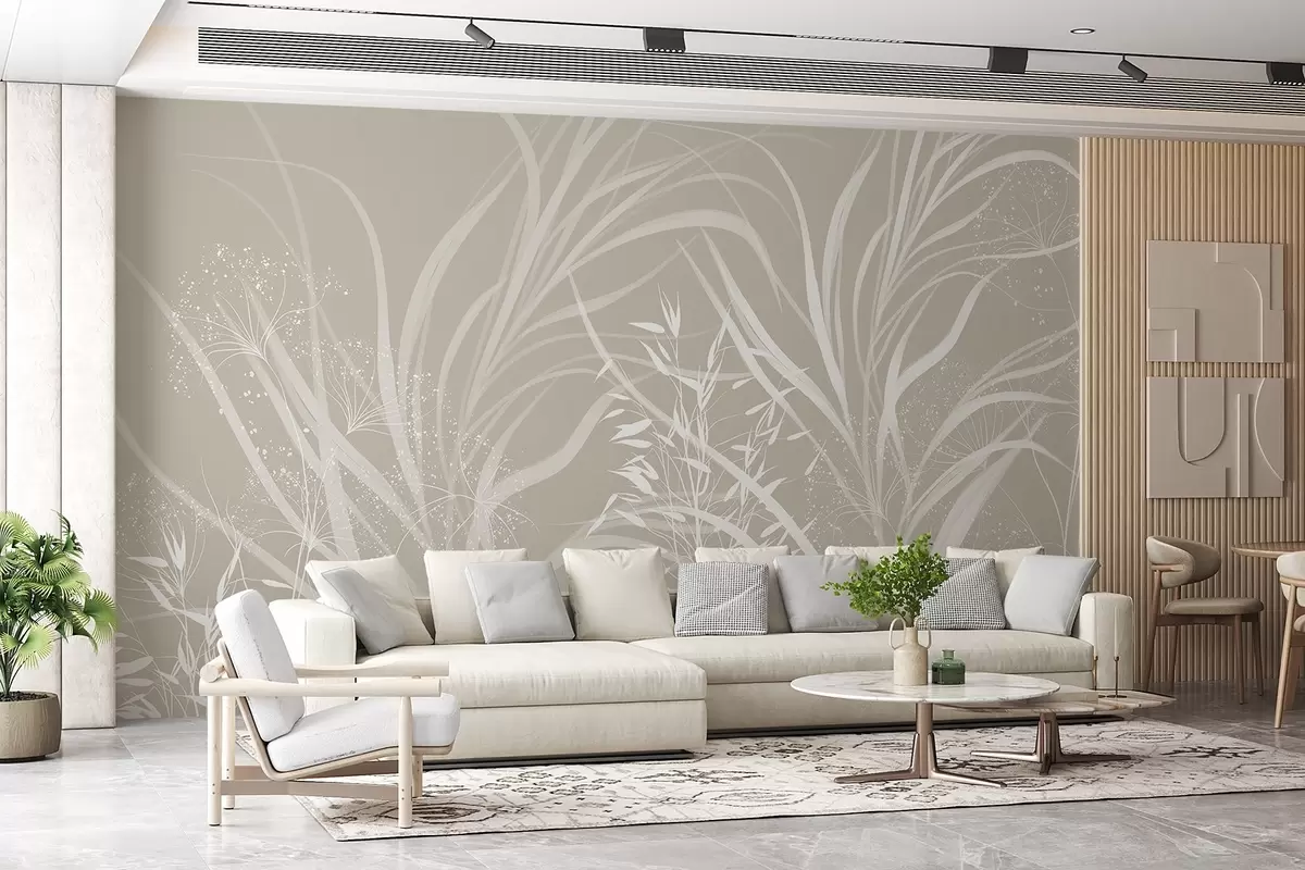 Fototapetes Delikāta, mūsdienīga, minimālisma stilā veidota balta ziedu apdruka uz gaiša pasteļbēša fona Nr. w08583