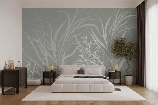 Fototapetes Delikāta, mūsdienīga, minimālisma stilā veidota balta ziedu apdruka uz gaiši pasteļzaļa fona w08583v1