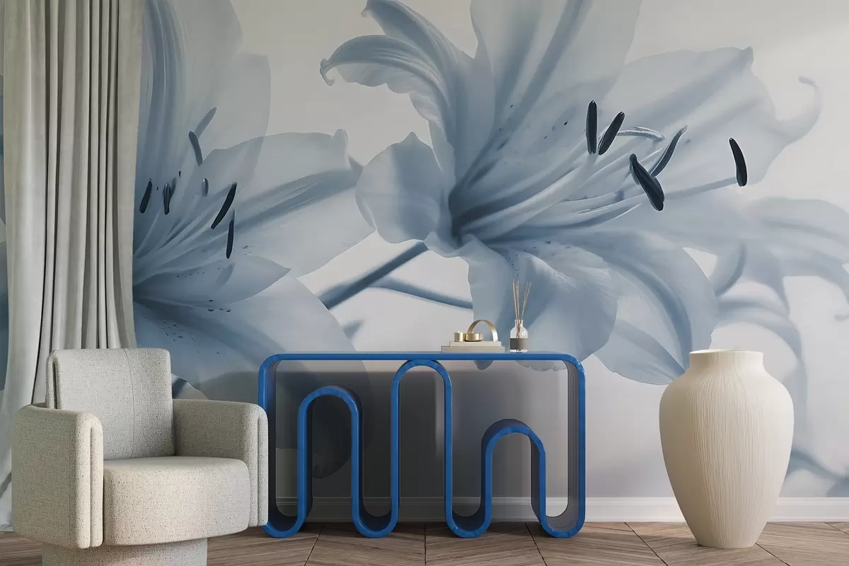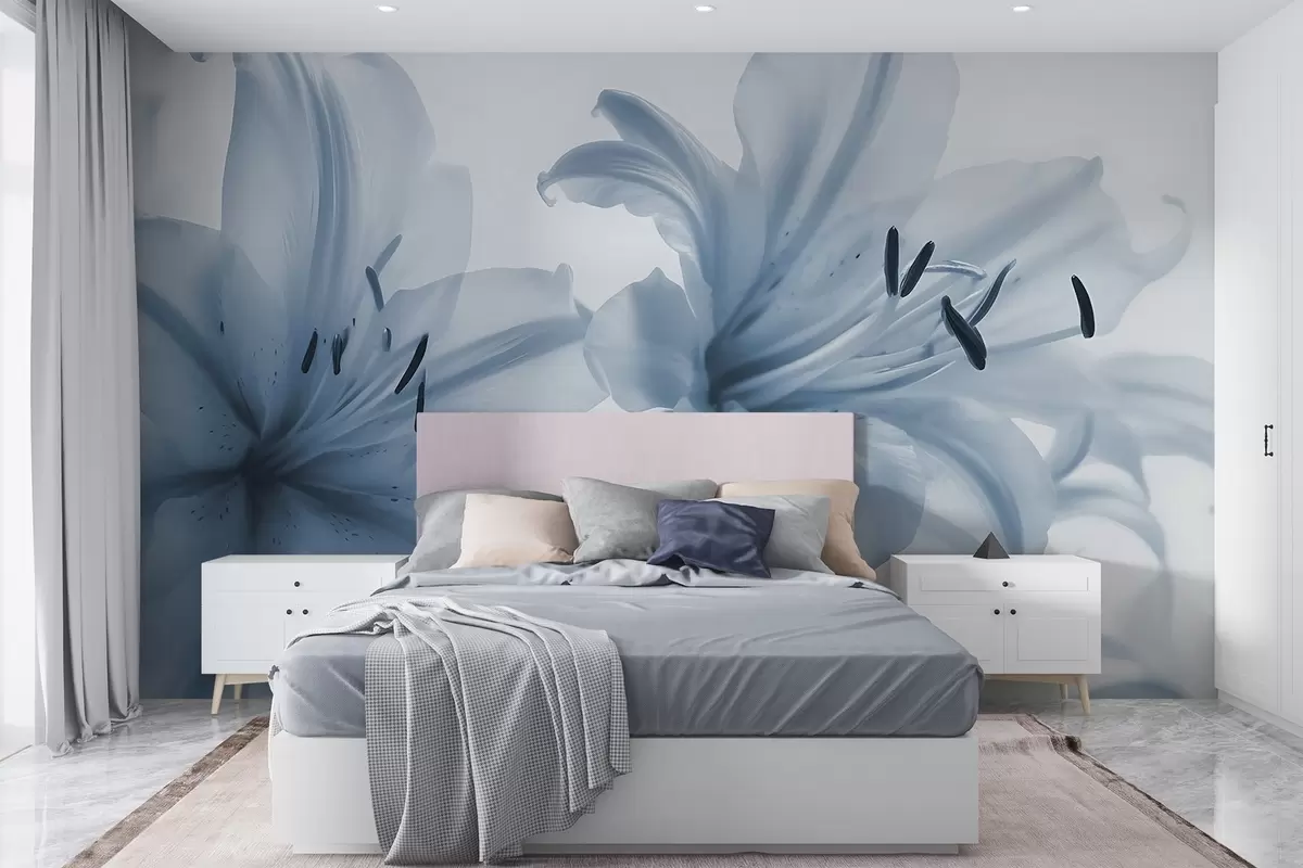Fototapetes Zilu minimālistisku liliju ziedu mīksts fokuss tuvplānā uz gaiša fona Nr. w08586
