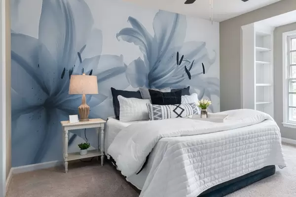 Fototapetes Zilu minimālistisku liliju ziedu mīksts fokuss tuvplānā uz gaiša fona Nr. w08586