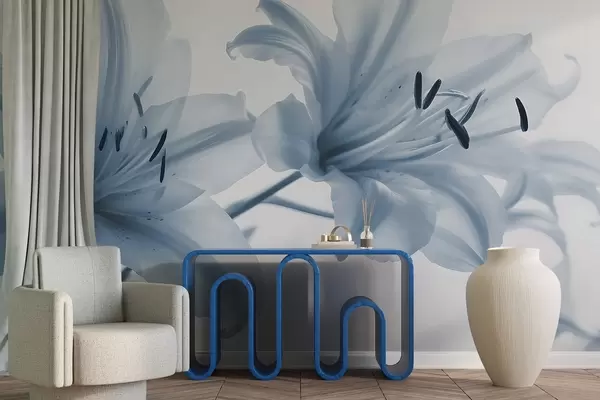 Fototapetes Zilu minimālistisku liliju ziedu mīksts fokuss tuvplānā uz gaiša fona Nr. w08586