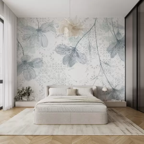 Fototapetes Smalki zili un balti ziedi ar gariem kātiņiem un ziedlapiņām uz mīksta, izplūduša faktūras fona Nr. w08588