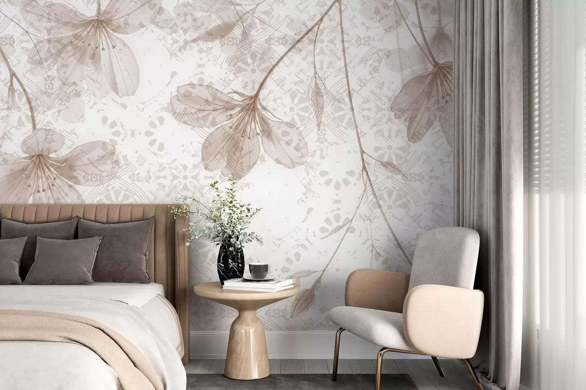 Fototapetes Smalki smilškrāsas un balti ziedi ar gariem kātiņiem un ziedlapiņām uz mīksta, izplūduša faktūras fona w08588v1