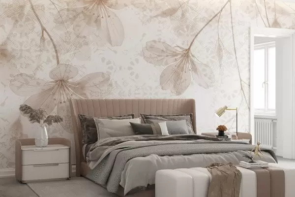 Fototapetes Smalki smilškrāsas un balti ziedi ar gariem kātiņiem un ziedlapiņām uz mīksta, izplūduša faktūras fona Nr. w08588v1