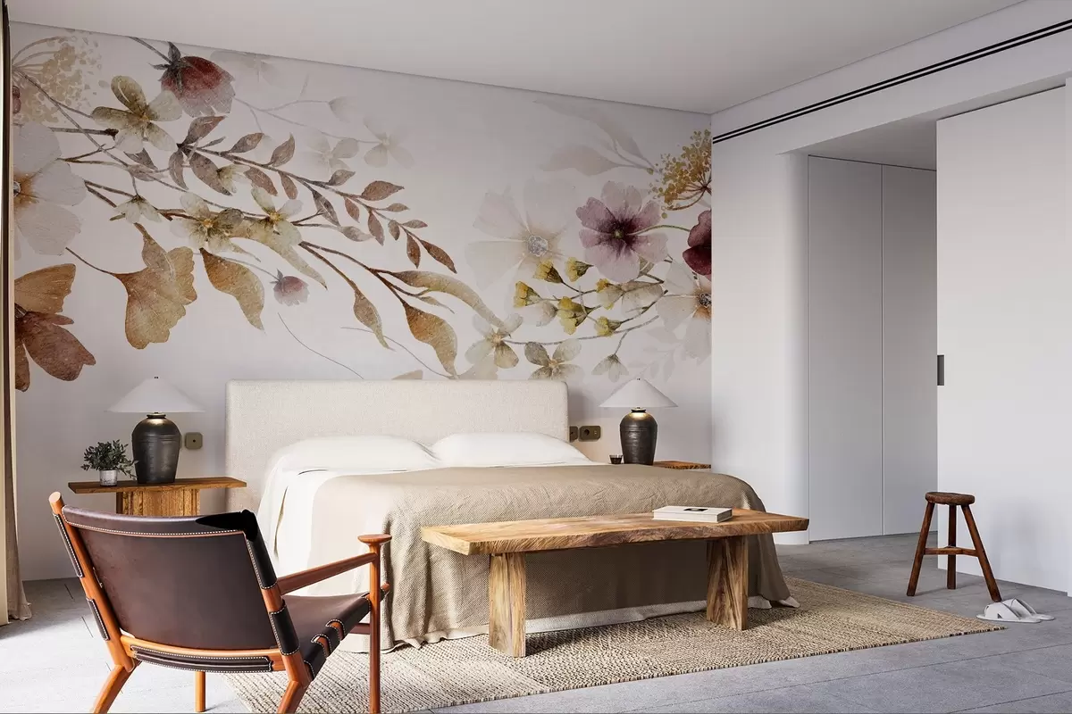 Fototapetes Ziedu kompozīcija ar maigām, pieklusinātām krāsām ar smilškrāsas un baltiem ziediem un lapām uz gaiša fona Nr. w08603