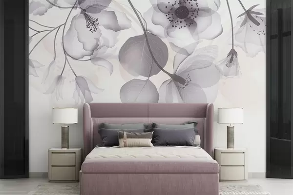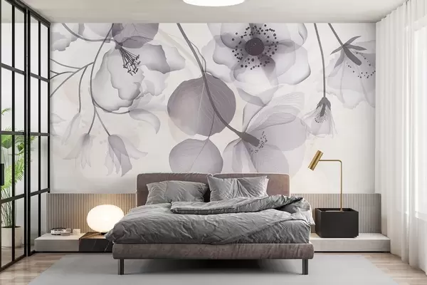 Fototapetes Smalki pelēki un bēši caurspīdīgi ziedi ar mīkstām ziedlapiņām un tumšiem centriem uz gaiša fona Nr. w08613v2