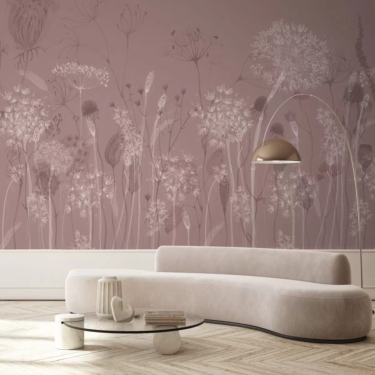 Fototapetes Gaisīgas pienenes un savvaļas puķes akvareļu stilā rozā toņos Nr. w08637v1