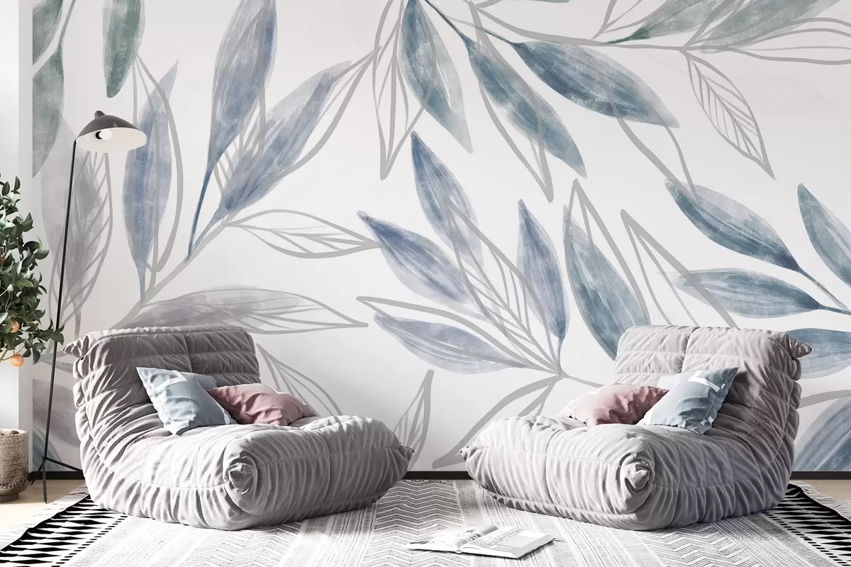 Fototapetes Delikātas zilas un pelēkas pasteļtoņu lapas, kas veido mierīgu un minimālisma pilnas krāsas botānisku kompozīciju Nr. w08642v1
