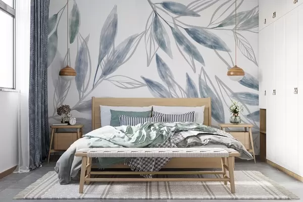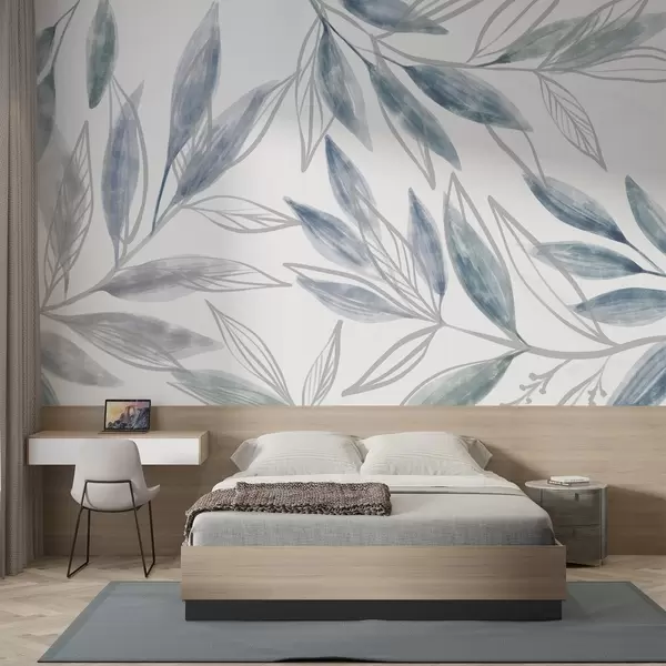 Fototapetes Delikātas zilas un pelēkas pasteļtoņu lapas, kas veido mierīgu un minimālisma pilnas krāsas botānisku kompozīciju Nr. w08642v1