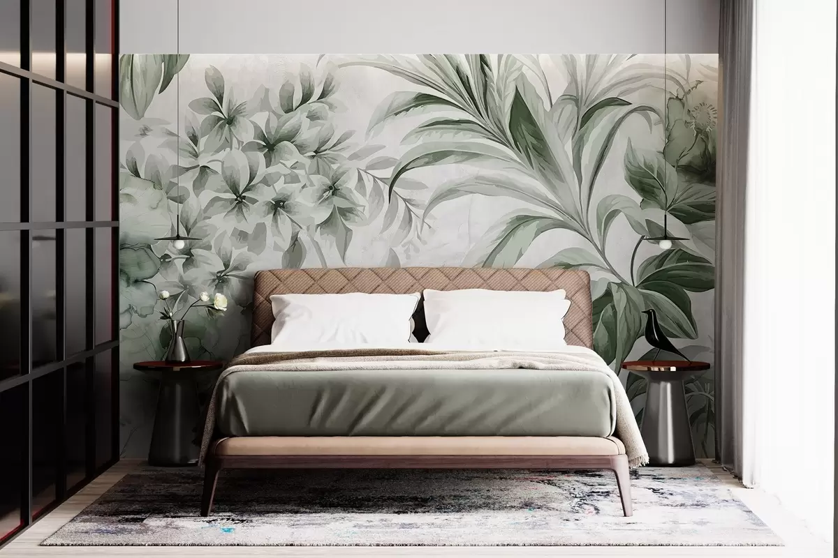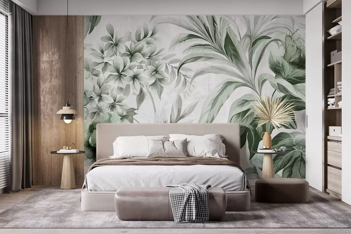 Fototapetes Tropu lapas un zaļumi pieklusinātā paletē no gaiši līdz tumši zaļiem toņiem uz teksturēta gaiša fona Nr. w08650