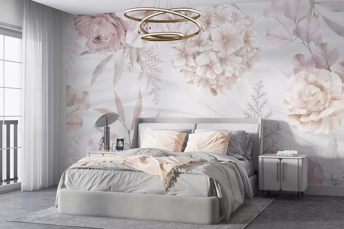 Fototapetes Maigs, abstrakts ziedu raksts ar lieliem rozā un baltiem ziediem, maigām lapām un pieskaņotu pasteļkrāsu paleti Nr. w08651