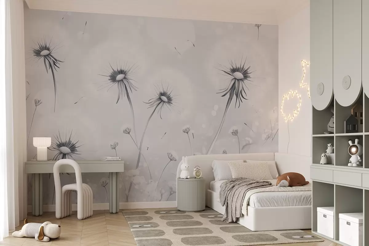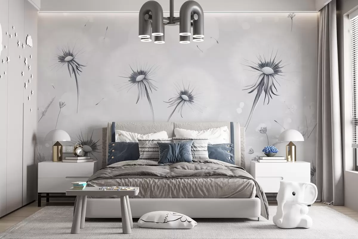 Fototapetes Elegantas pienenes un savvaļas puķes gleznošanas stilā zilos toņos Nr. w08657v2