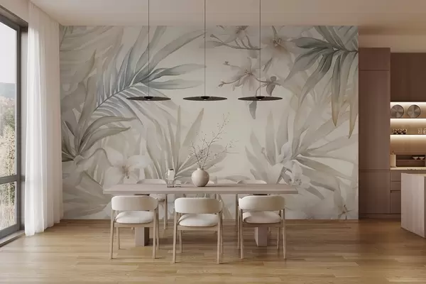 Fototapetes Tropu lapu un ziedu pasteļkrāsas ar gaiši zaļiem, krēmkrāsas un maigi sārtiem toņiem Nr. w08660